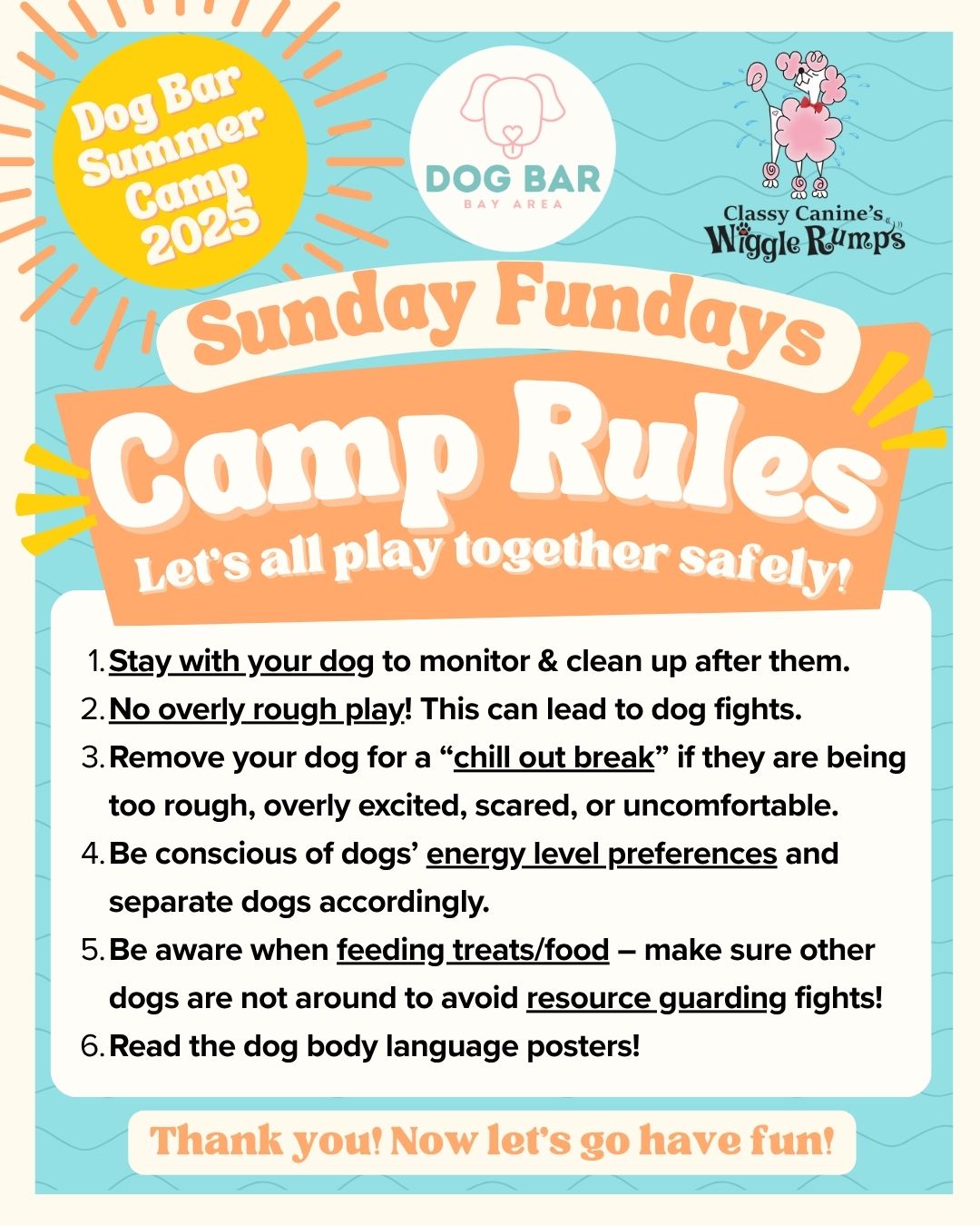 - Please stay with your dogs and monitor their play so that all the pups can have a happy and safe time at Dog Bar Sunday Fundays.