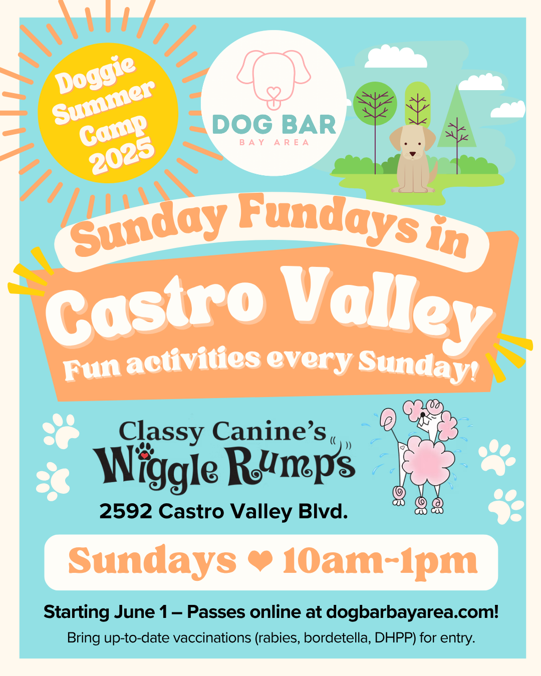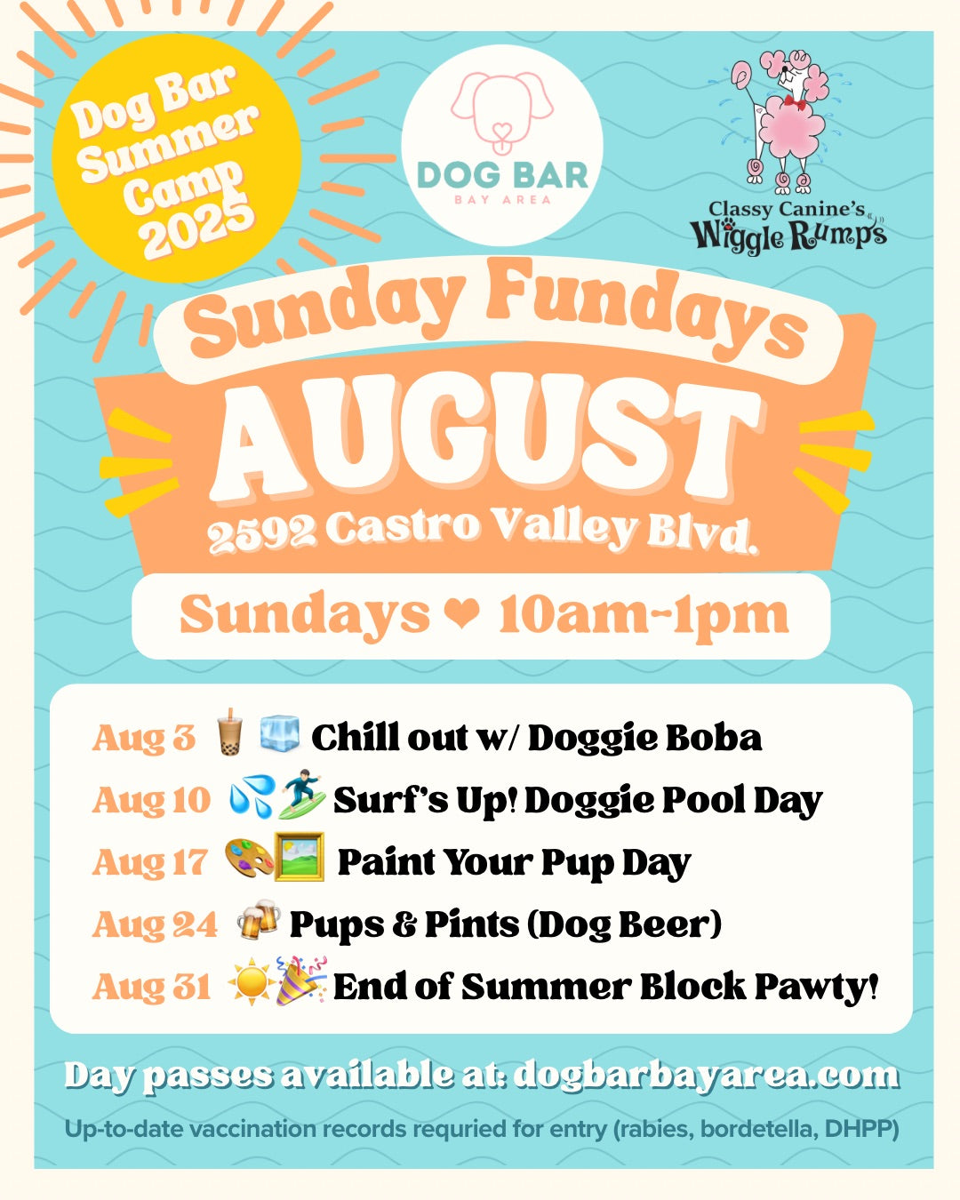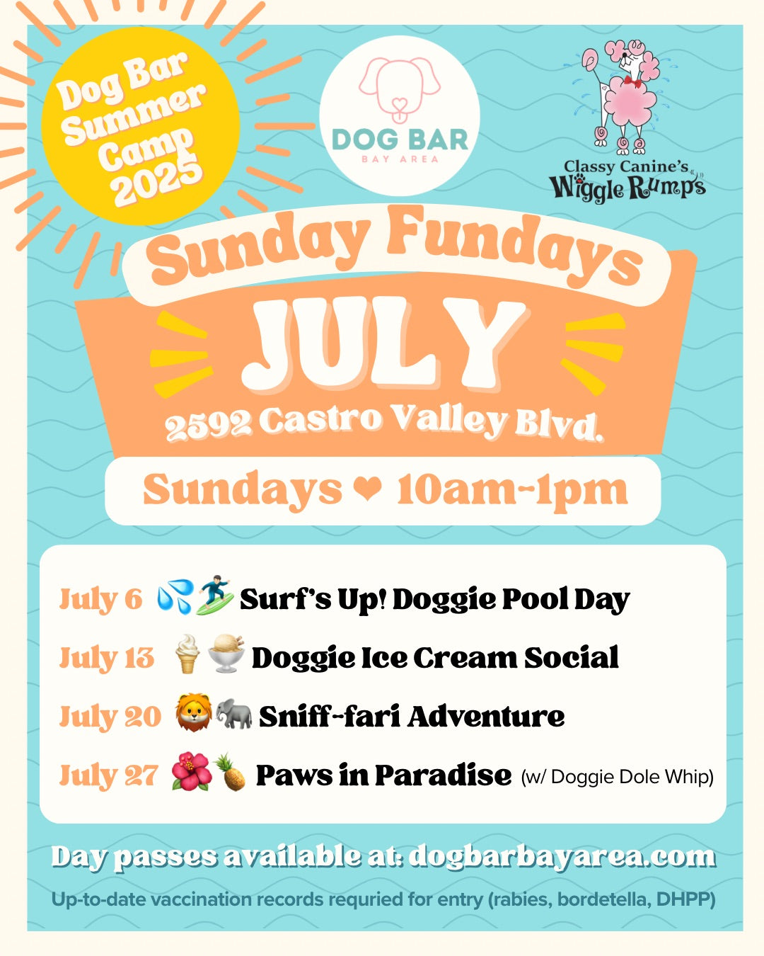Ready to enjoy the beautiful summer sun with your pups this season? โ๏ธ๐ We are too! Dog Bar is partnered with Wiggle Rumps in Castro Valley (2602 Castro Valley Blvd) to host an EXCLUSIVE weekly SUMMER CAMP for dogs! ๐พ Fun, unique activities and events for you and your pup to enjoy EVERY SUNDAY from June โ August Summer 2025!